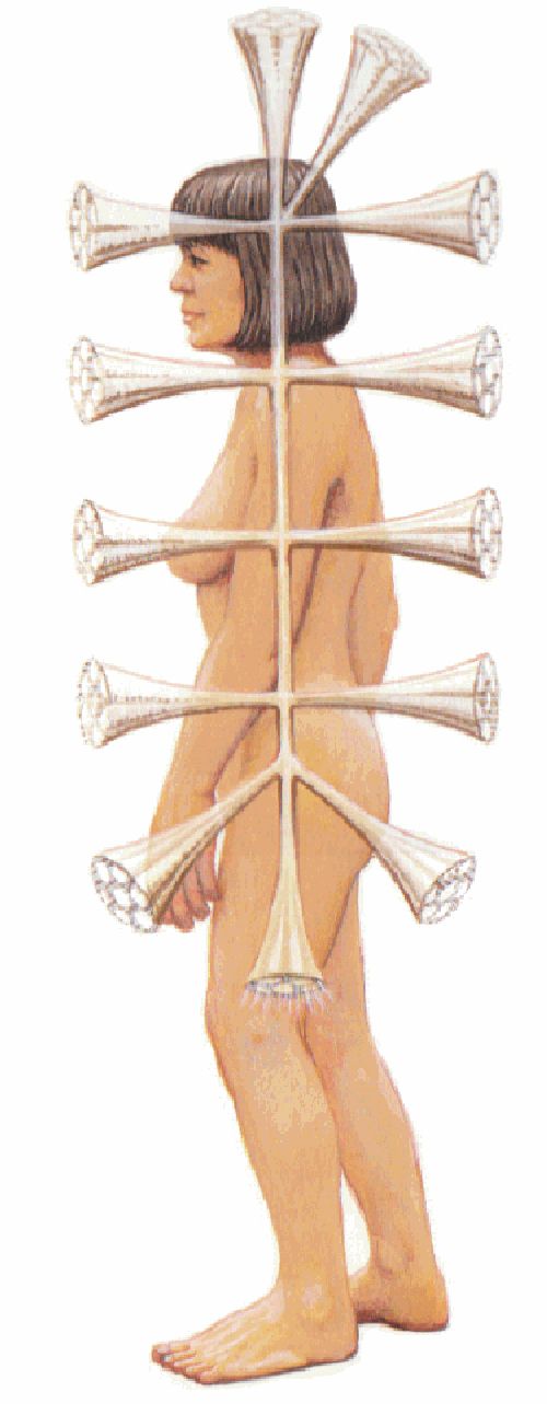 The chakra system provides connection between the bodies. Each chakra provides a link to power each connected body and to carry information and instructions. It functions similarly to the windings of an electrical transformer, which draws power from a central core and provides separate feeds at different frequency and voltage. The rear or will feeds provide communication whilst the front or power feeds provide access to needed energy. You may locate your own chakra positions easily. Take the distance between the point of the nose and the point of the chin as a separation distance. Start at the perineum (the point midway between the anus and scrotum or vagina), this is the location of the root chakra. Measure one distance from the Root to the Caudal chakra, another to the Solar Plexus. Skip one here as this spot is used by the guides as a plug in point. The next is the Heart, then the Throat. Skip the chin and the nose, then it’s the Brow or Third Eye, the Crown and then the Causal. The Sushumna is the vertical tube containing the energy flowing between the Earth Star and Soul Star chakras. Outside of this, the tube extends both up and down. The upward section is called the Antakarana, which connects most bodies up to the Causal level. The downward section is called the Antirenun and extends downward to the energetic core of the planet. The location of the chakras appears to have changed over the past 200 years as humankind has evolved.